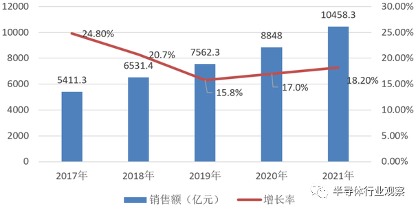 据中国半导体行业协会发布的统计数据,国内集成电路产业继续过去几年的快速、平稳增长态势,产业总营收在2021年更是首次突破万亿元达10458.3亿元,同比增长18.2%。其中,设计业销售额为4519亿元,同比增长 19.6%;制造业销售额为3176.3亿元,同比增长24.1%;封装测试业销售额2763亿元,同比增长10.1%。
